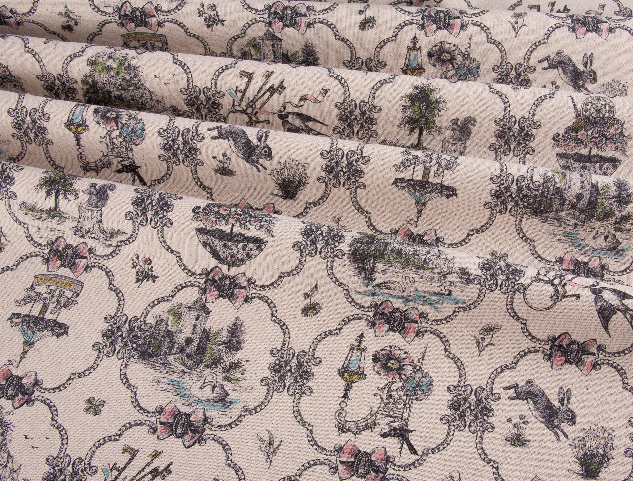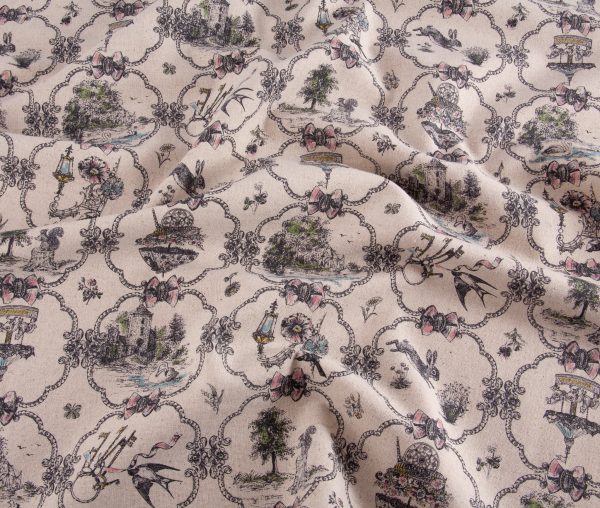 A cotton blend fabric featuring a delicate print of Parisian scenes in frames on a linen textured background. A lovely fabric that resembles a lightweight canvas, perfect for bags, cushions and light upholstery.