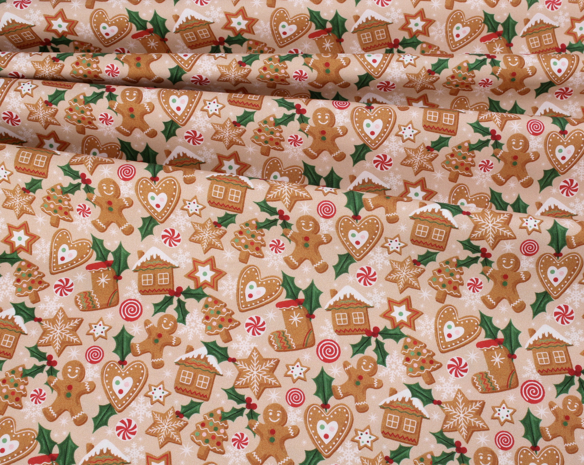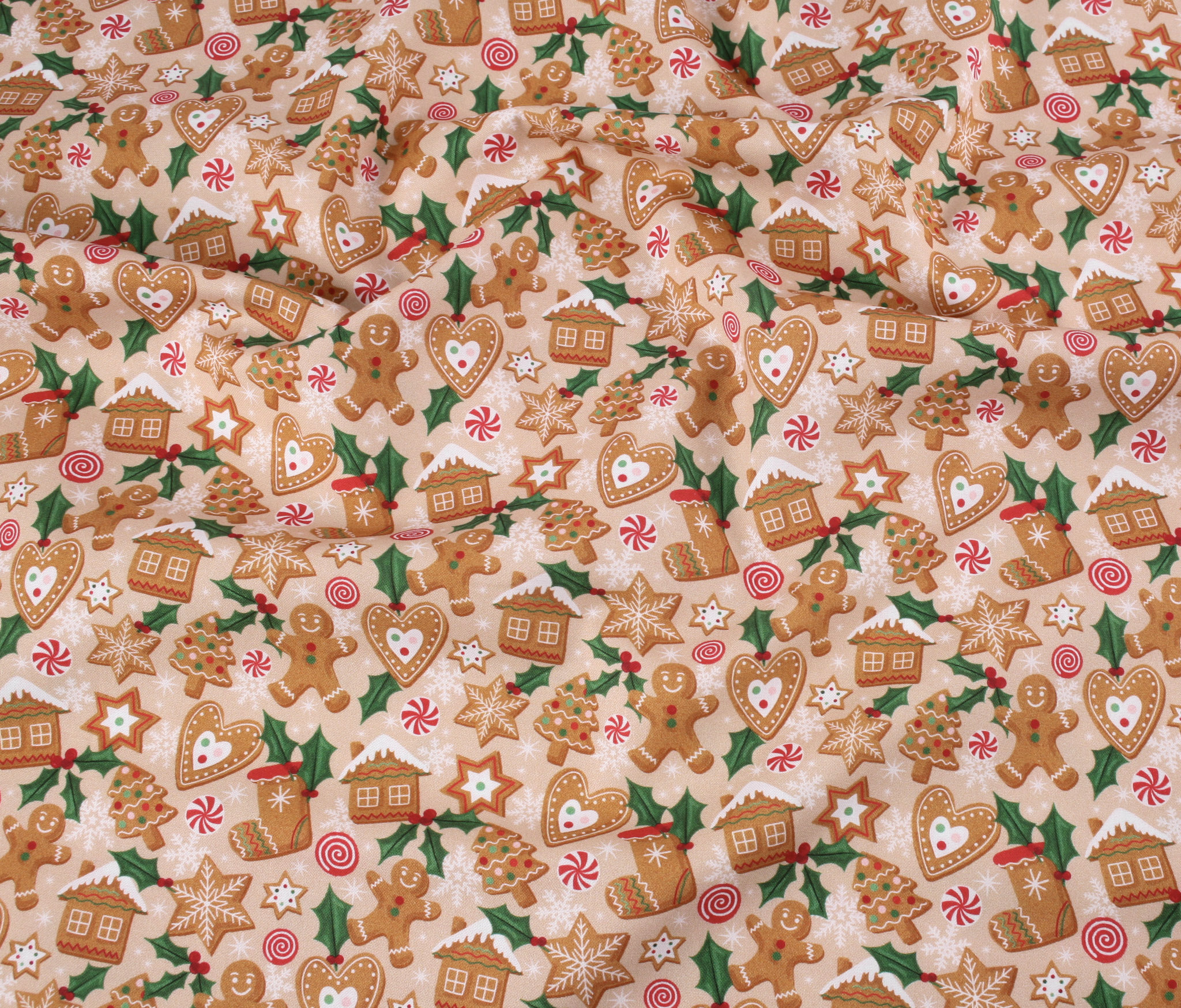 This fabric features an all over gingerbread scene for the festive season! Perfect for Christmas gift bags, home décor and accessories Christmas