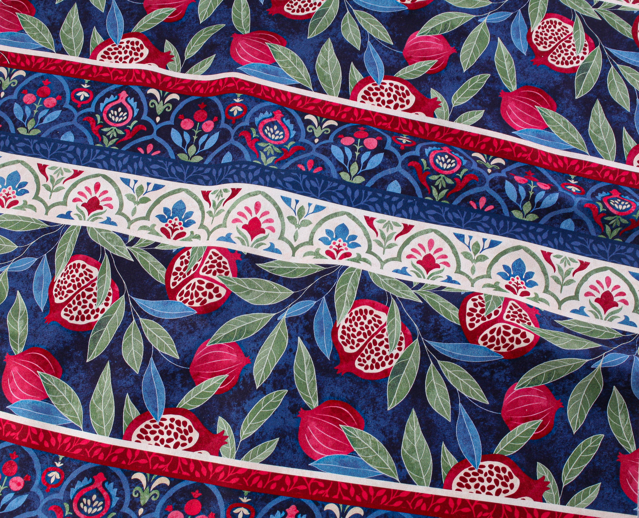 Part of the digitally printed Pomegranate collection by Northcott, Northcott Studio’s new Pomegranate collection brings classic Arts & Crafts style into the present day with its beautifully detailed pomegranates, leafy motifs and a timeless palette of navy, red, cream and green.
