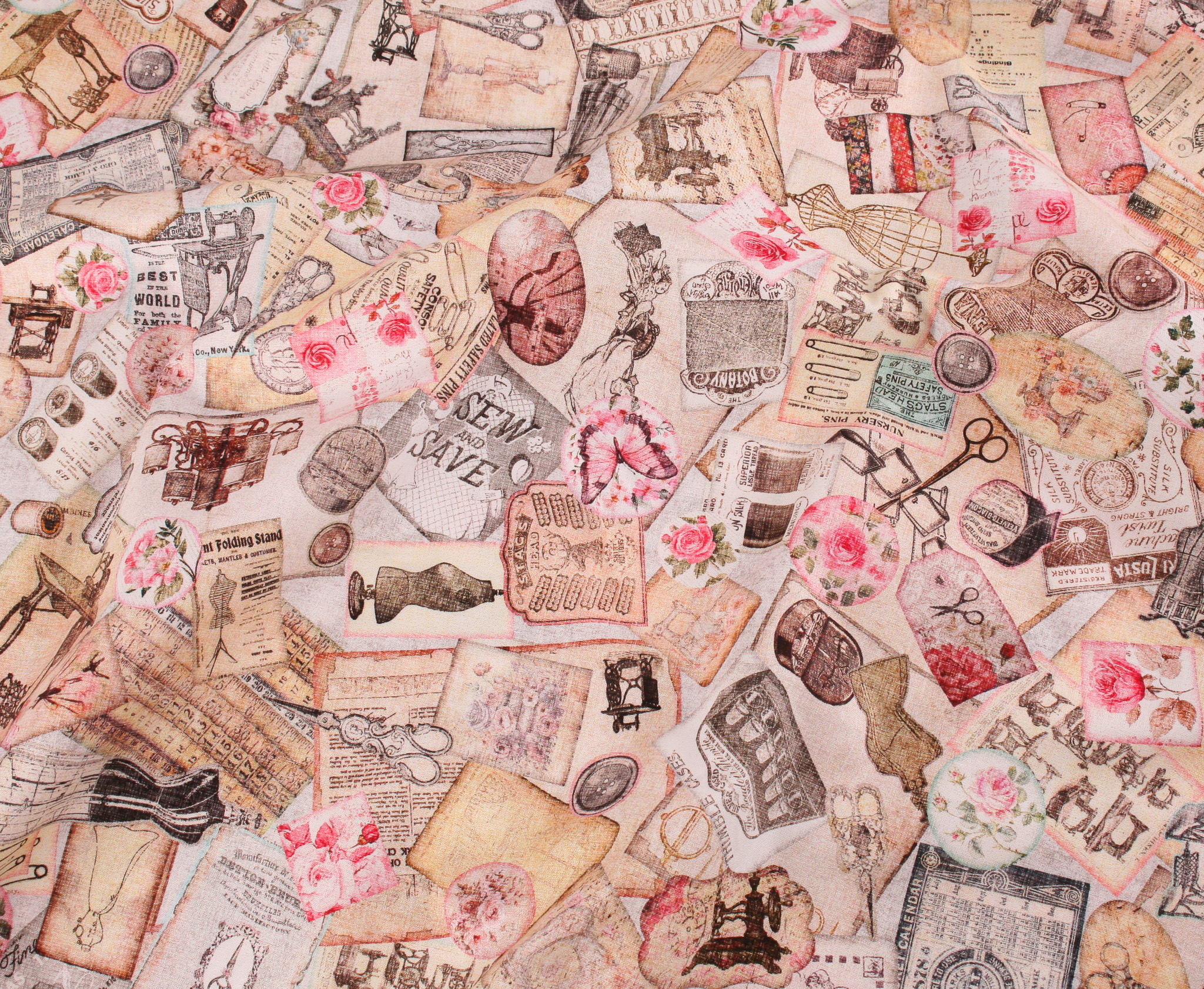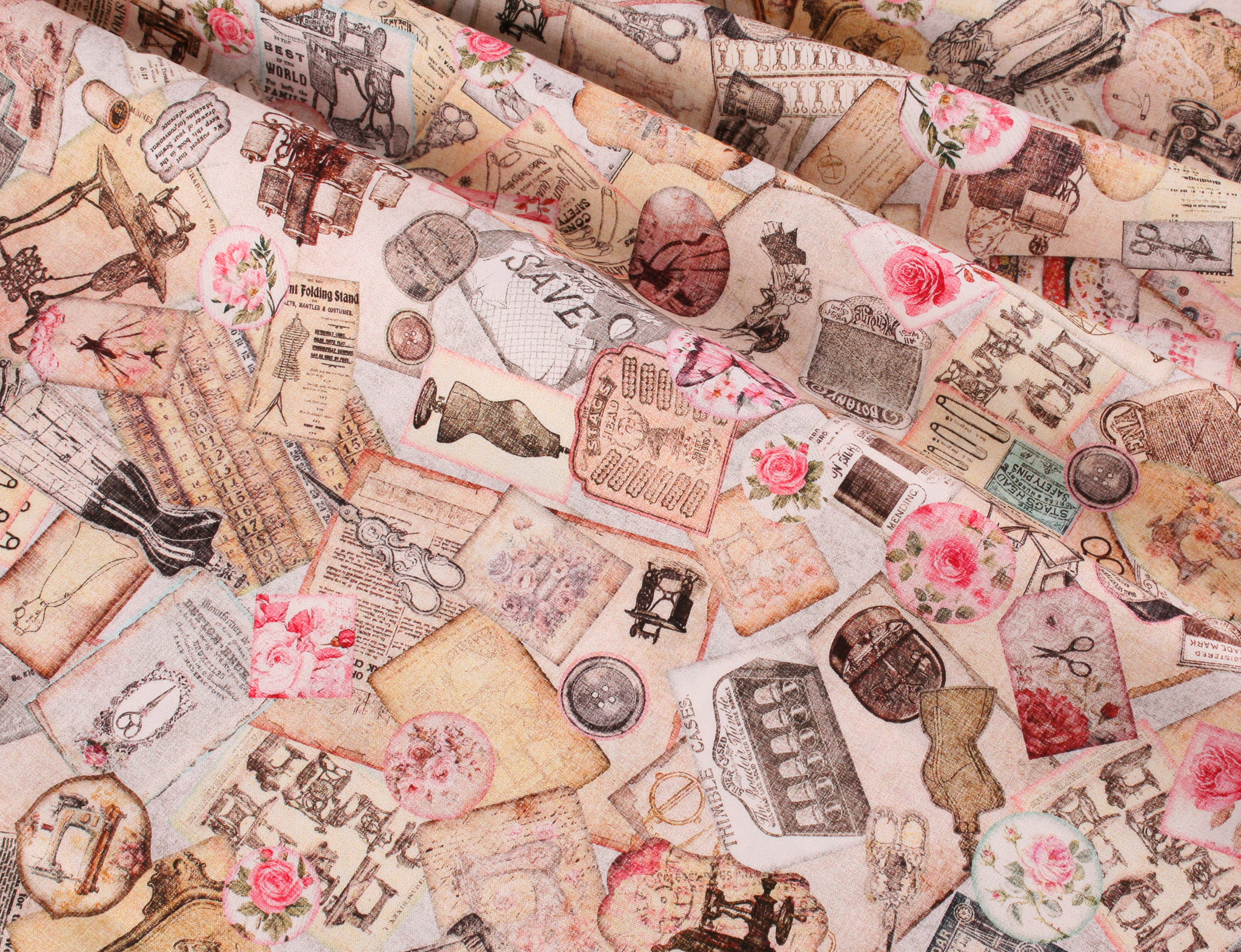 Antique styled sewing machines and sewing ephemera adorned with soft romantic roses blend for vintage charm and a touch of nostalgia. Create a treasured project for a quilting/sewing enthusiast with timeless elegance.