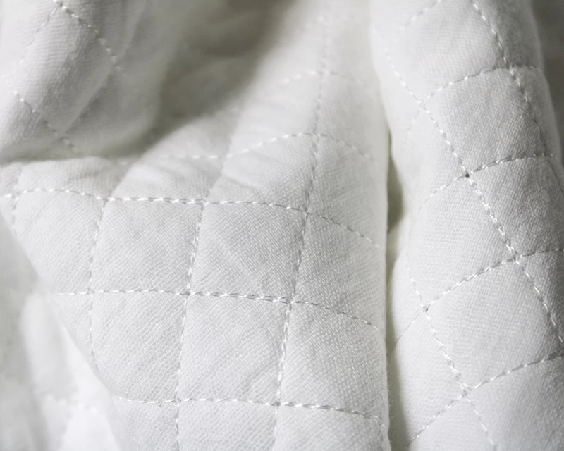 Double gauze is a fabric that consists of two layers of fine open woven cotton. They are attached with tiny stab stitches at regular intervals, usually every centimetre, in a grid pattern, though this is barely visible. It is incredibly soft to the touch and can be a tiny bit transparent.
