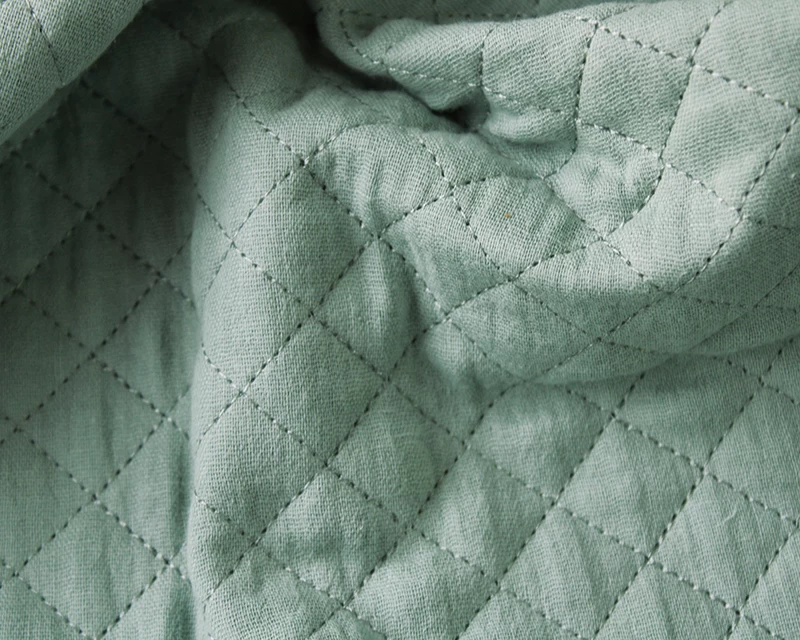 Double gauze is a fabric that consists of two layers of fine open woven cotton. They are attached with tiny stab stitches at regular intervals, usually every centimetre, in a grid pattern, though this is barely visible. It is incredibly soft to the touch and can be a tiny bit transparent.