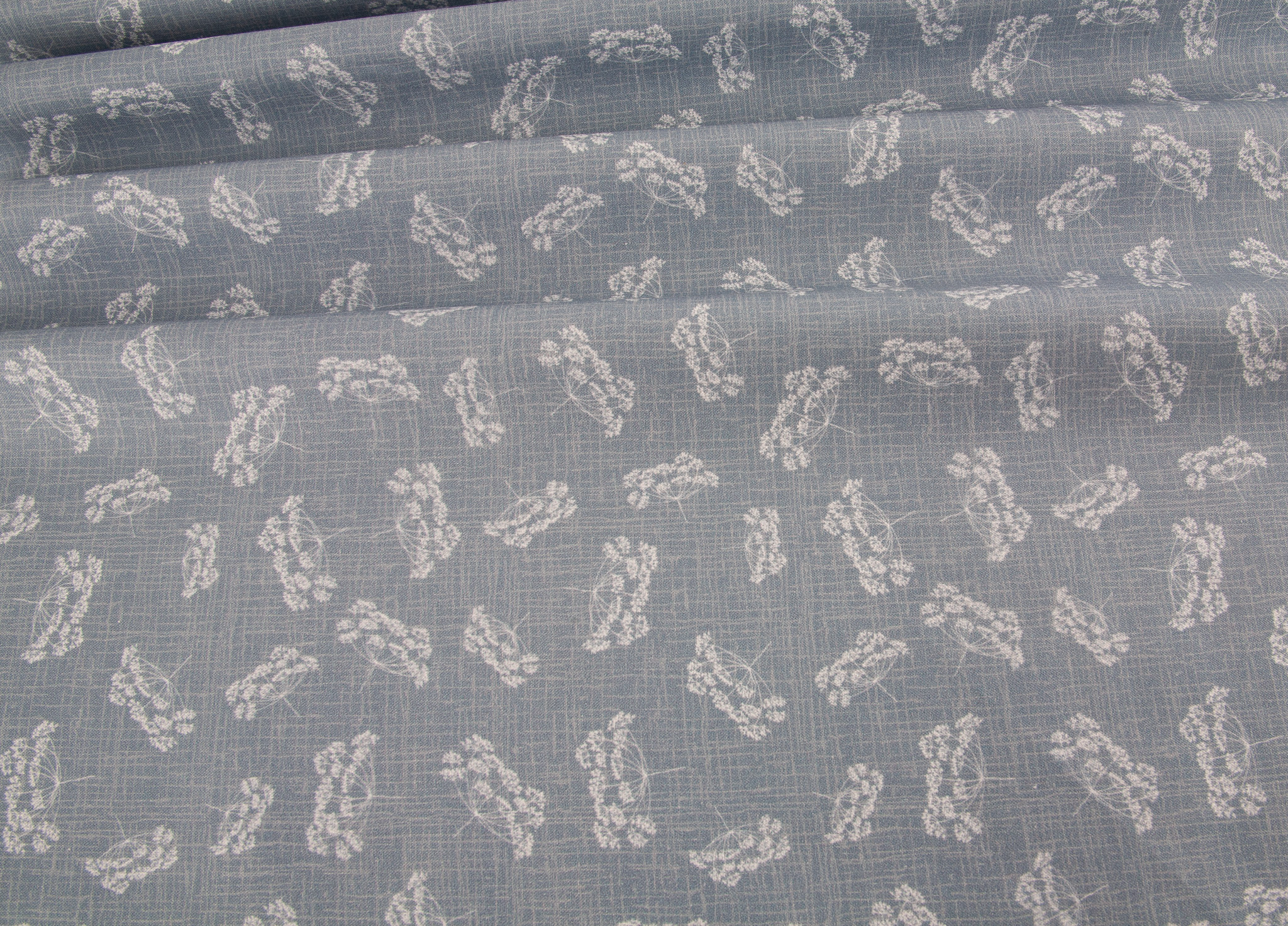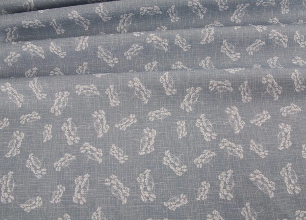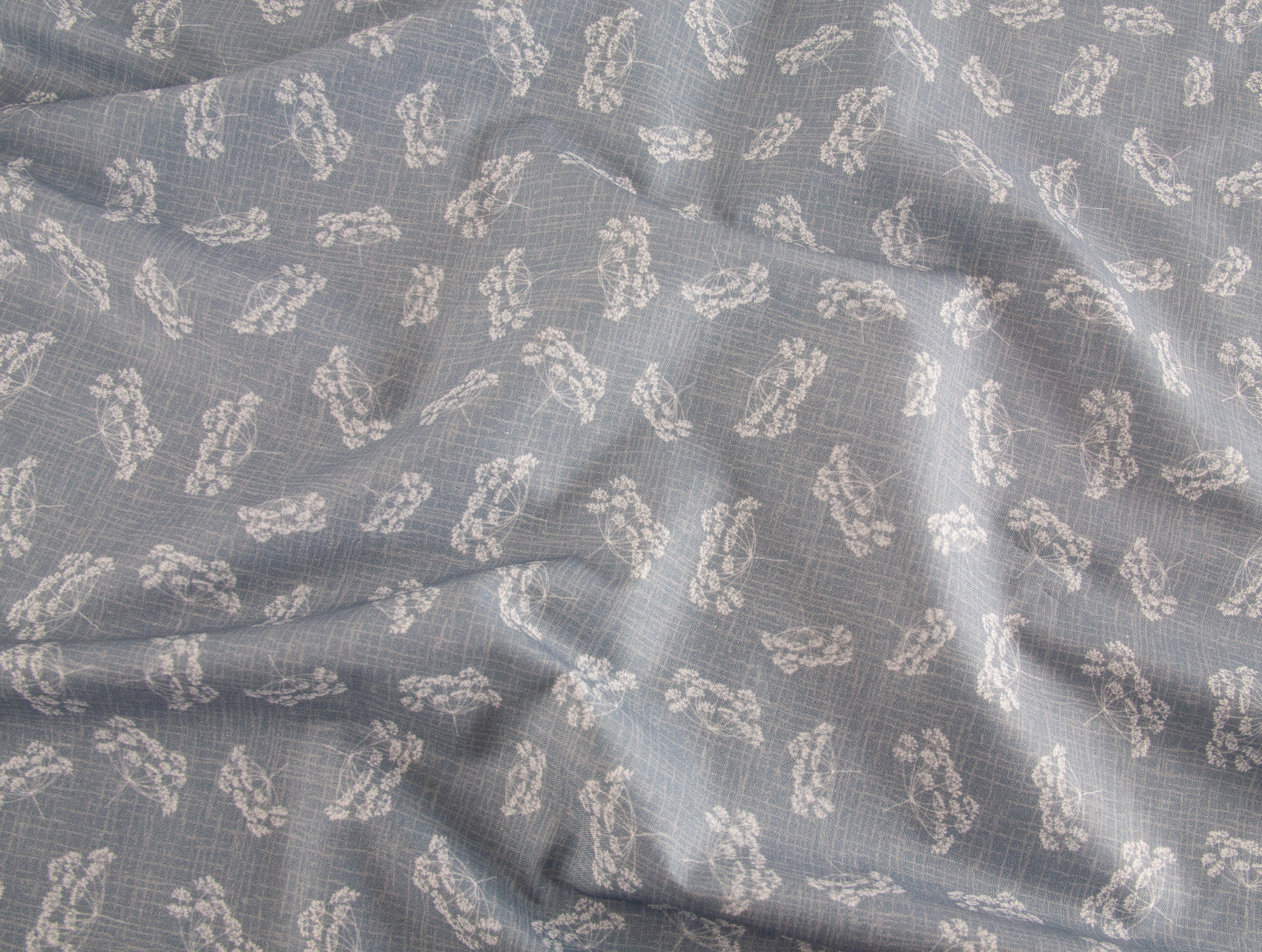 Beautifully designed cotton fabric, cow slips on a textures blue-grey background.