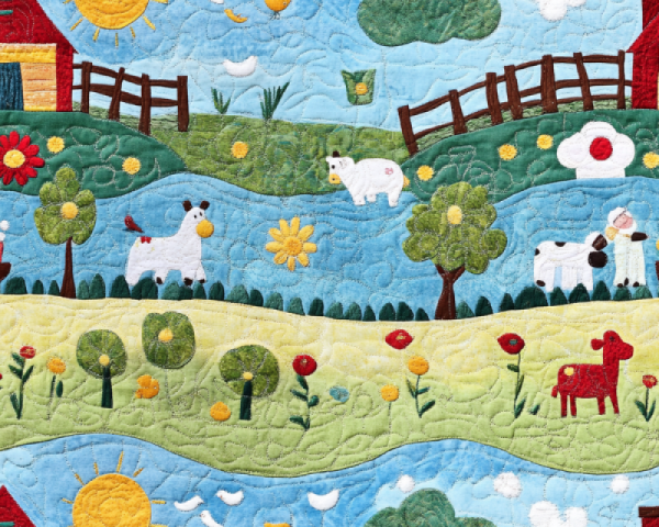Soft and stretchy cotton jersey fabric featuring a charming farm-themed print with animals and tractors, perfect for sewing kids’ clothing, pajamas, and playful apparel.