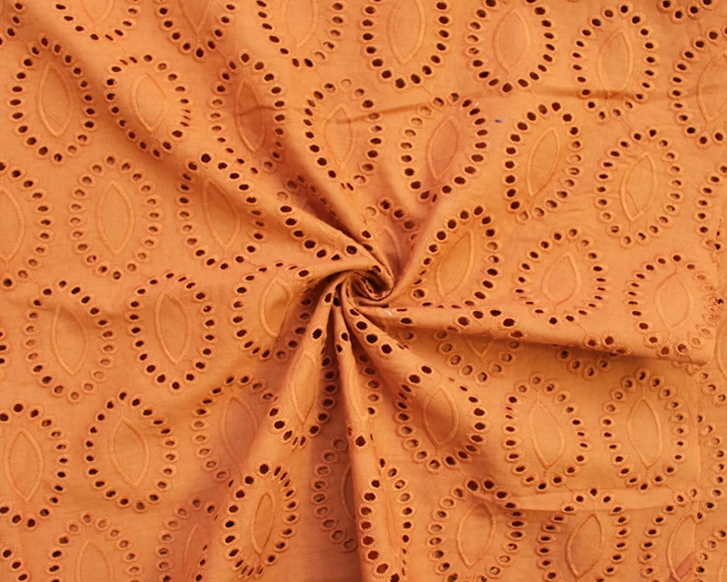 A lightweight and breathable cotton fabric featuring delicate embroidered eyelets, perfect for elegant clothing, summer wear, and craft projects.