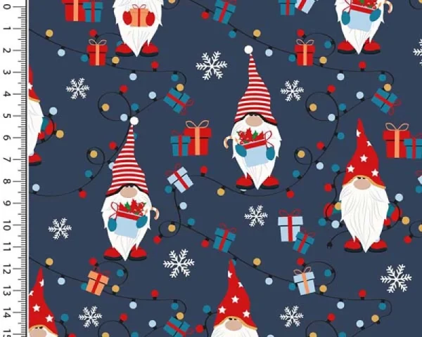 Festive Gnomes features charming bearded characters, twinkling fairy lights, snowflakes and wrapped gifts. Printed on crisp 100% cotton poplin (115gsm), it’s perfect for Christmas PJs, tablecloths, stocking fillers, tote bags and more