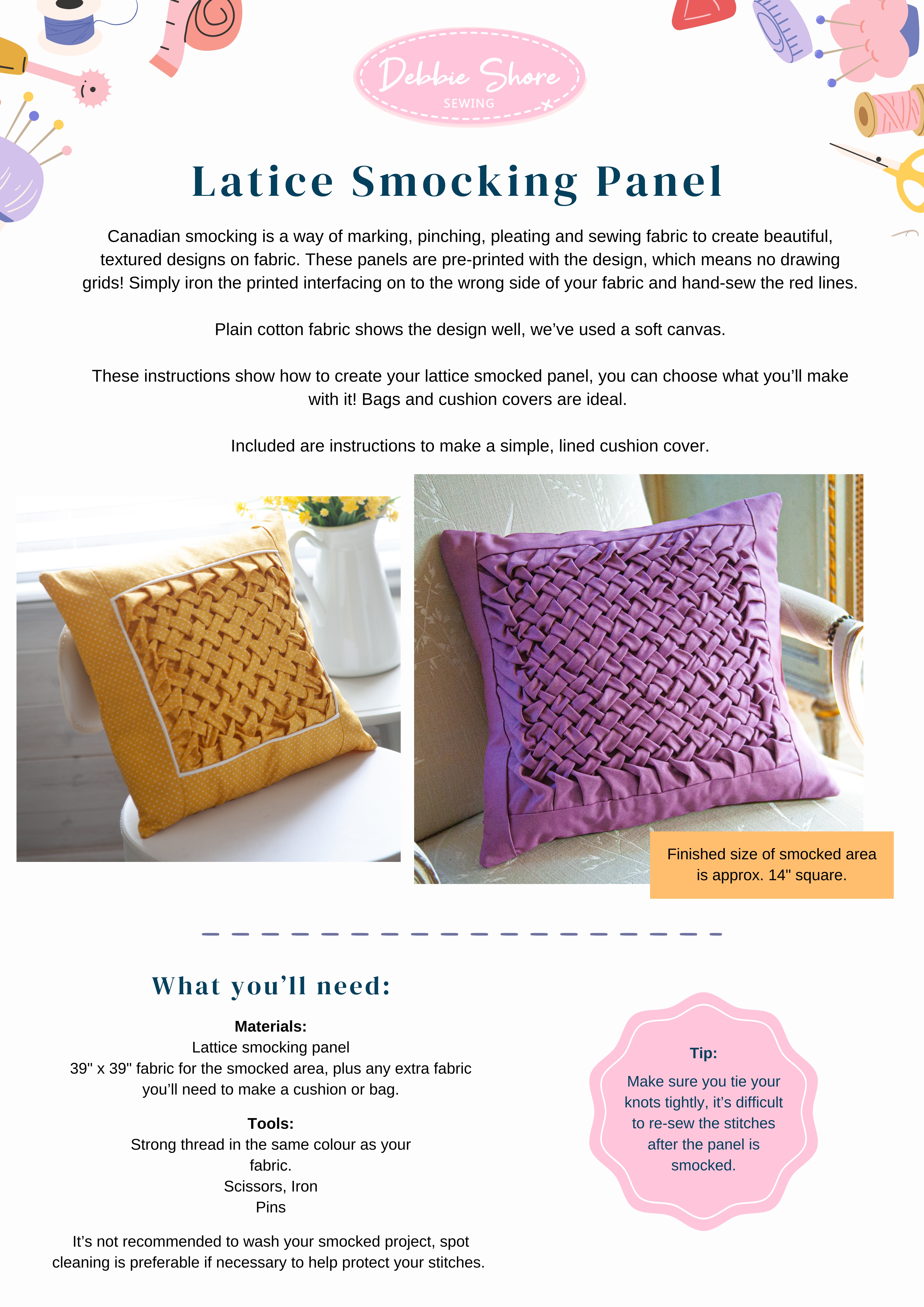 These instructions show how to create your lattice smocked panel, you can choose what you’ll make with it! Bags and cushion covers are ideal.