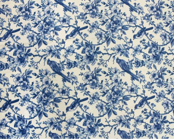 A soft linen-viscose blend fabric featuring charming bird and floral prints, perfect for creating elegant clothing, home decor, and craft projects.