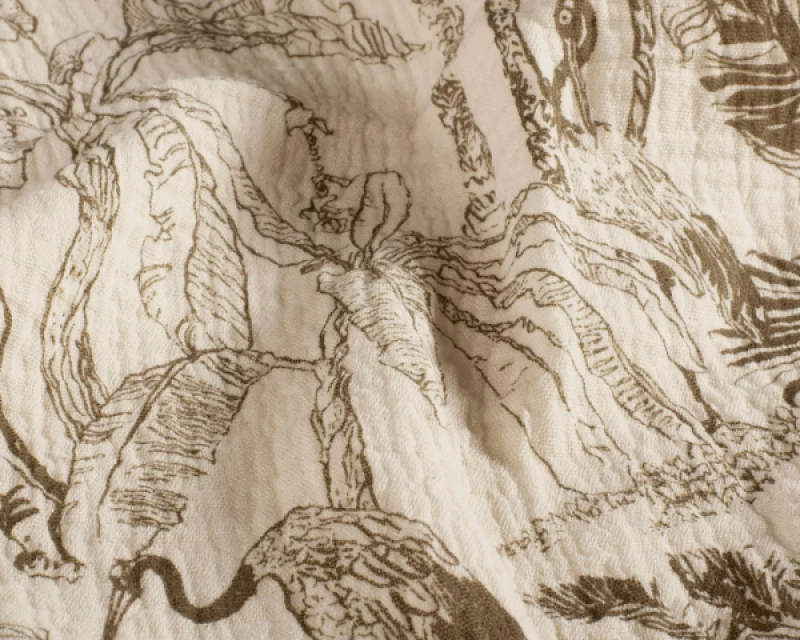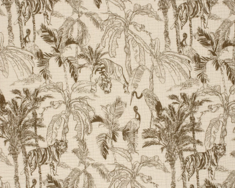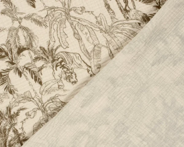 This soft, lightweight muslin gauze features a hand-drawn jungle scene complete with tigers, tropical birds, and leafy palms in earthy brown. It’s 100% cotton and 130cm wide, making it a dream for breezy clothing, nursery decor, or statement home projects.